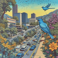 Bustling City with Blooms and Birds
